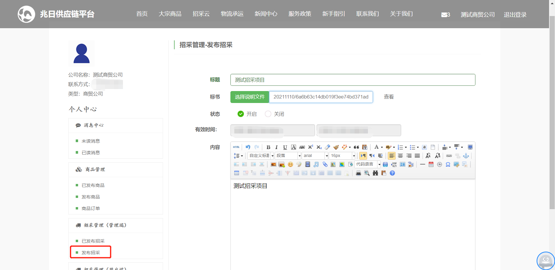 进入个人中心,再进入招采管理(管理端)下的发布招采页面,填写需要发布招采项目的详细信息并提交。