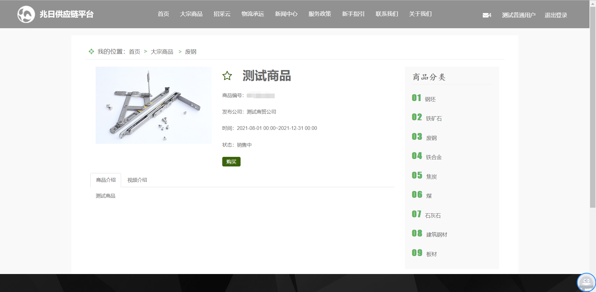 普通用户可以在平台首页的大宗商品栏目,或进入更多进行查看,通过点击商品图片,可以进入商品的详细信息展示页面。
